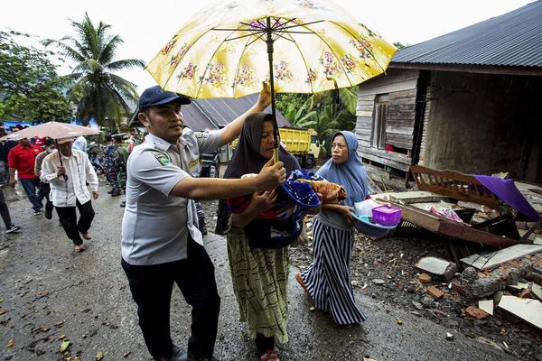 An official evacuates a woman with her baby after a revised 6.1 magnitude quake in Nagari Pinagar Village of Pasaman Barat district in West Sumatra, Indonesia, Feb. 25, 2022. (Photo by Andry Mardiansyah/Xinhua)