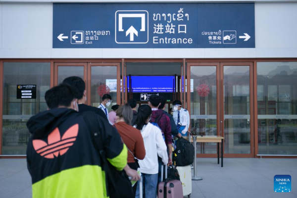 As of Feb. 22, the Lao section of the China-Laos Railway had run 146 pairs of EMU passenger trains, transporting 144,610 passengers, with a maximum of 2,804 on Jan. 3 and an average occupancy rate of 68.76 percent. (Photo by Kaikeo Saiyasane/Xinhua)