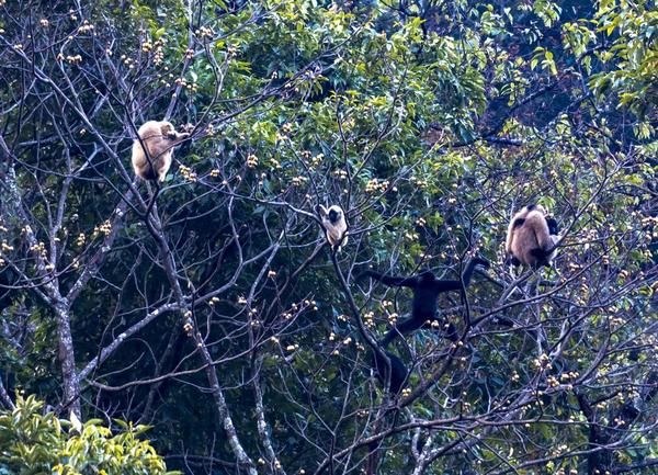Photo taken on Jan. 22, 2021 shows several western black crested gibbons collecting fruit on the tree in Pu'er, southwest China's Yunnan Province. (Xinhua/Chen Xinbo)