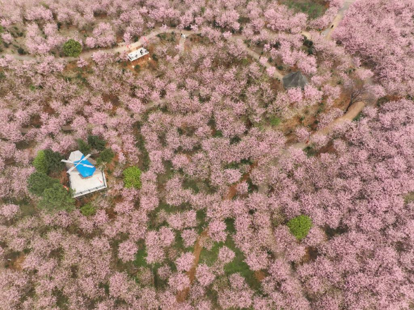 Aerial photo taken on March 12, 2022 shows cherry blossoms in Luoqiao Township of Changning City, central China's Hunan Province. (Xinhua/Zhao Zhongzhi)