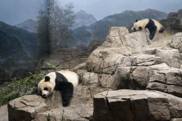 While the fluffy bears in black and white were all sleeping, people still enjoyed the sight of them while curious to learn knowledge of the valuable species through posters on the wall.