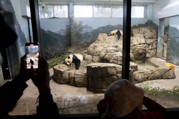 Tourists take photos of giant pandas at Smithsonian's National Zoo in Washington, D.C., the United States, on March 16, 2022. (Xinhua/Liu Jie)