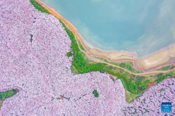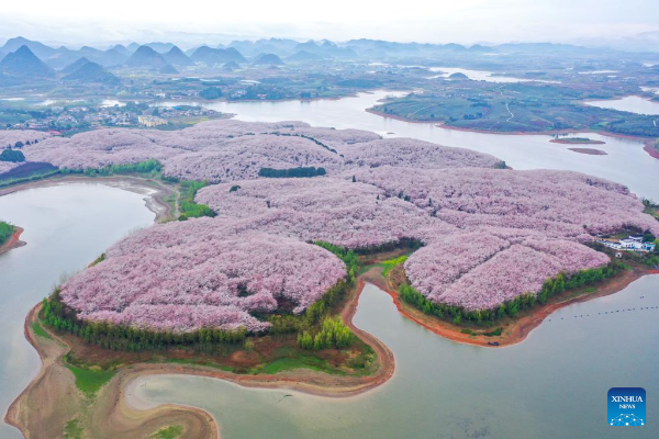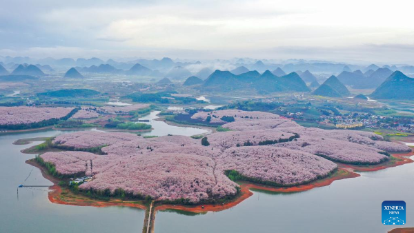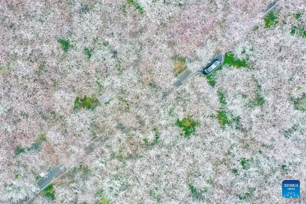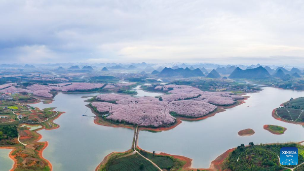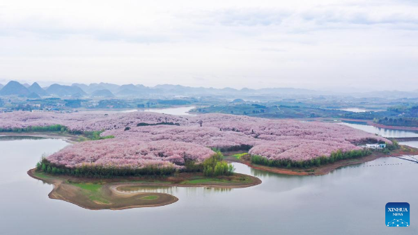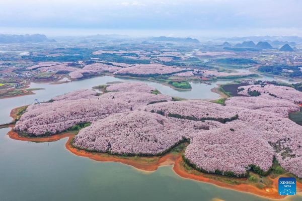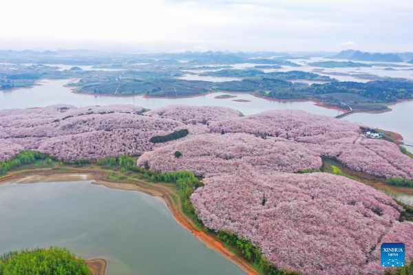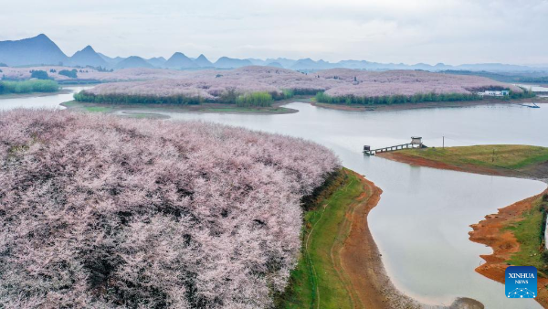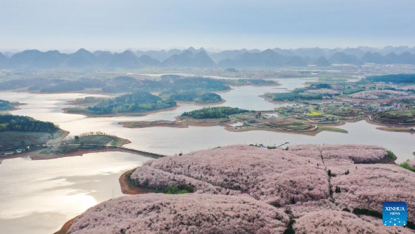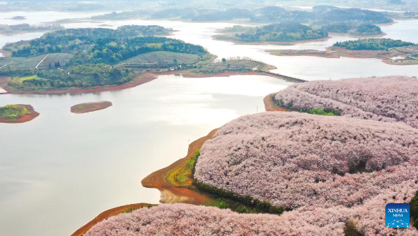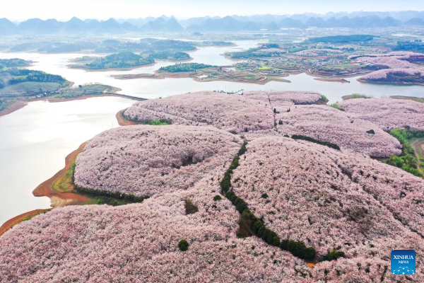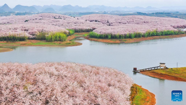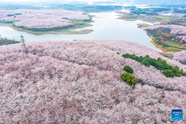 Aerial photo taken on March 17, 2022 shows blooming cherry blossoms at a cherry garden in Guian New Area of Guiyang, southwest China's Guizhou Province. Recently, a cherry garden covering an area of 24,000 mu (about 1,600 hectares) with 700,000 cherry trees ushered in blossoming season in Guiyang, attracting a large flow of tourists. (Xinhua/Ou Dongqu)
