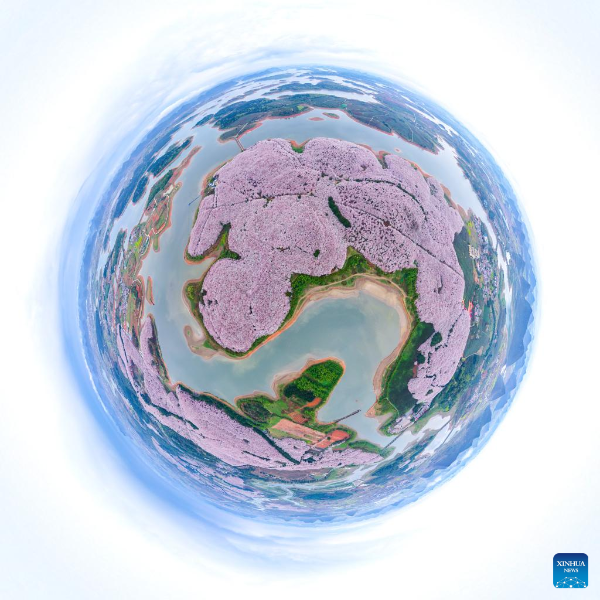 Aerial panoramic photo taken on March 17, 2022 shows blooming cherry blossoms at Guian New Area in Guiyang, southwest China's Guizhou Province. Recently, a cherry garden covering an area of 24,000 mu (about 1,600 hectares) with 700,000 cherry trees ushered in blossoming season in Guiyang, attracting a large flow of tourists. (Xinhua/Ou Dongqu)