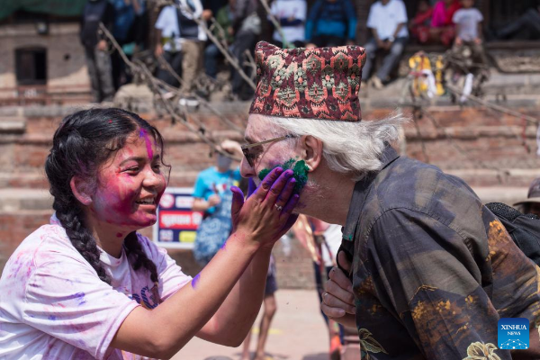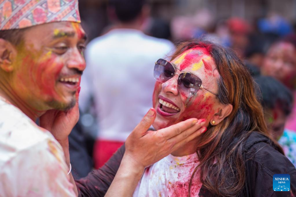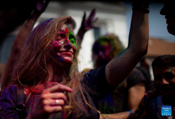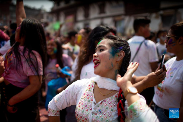 People celebrate Holi, the festival of colors, in Kathmandu, Nepal, March 17, 2022. (Photo by Sulav Shrestha/Xinhua)