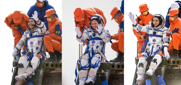 In this combo photo, astronauts Zhai Zhigang, Wang Yaping and Ye Guangfu (from L to R) are out of the return capsule of the Shenzhou-13 spaceship at the Dongfeng landing site in north China's Inner Mongolia Autonomous Region on April 16, 2022. (Xinhua)