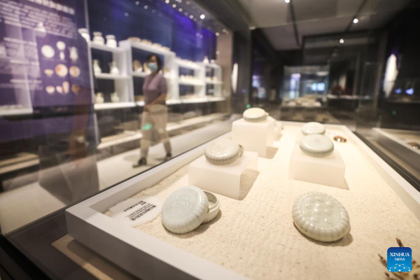 Photo taken on April 24, 2022 shows the bluish-white glazed powder cases with stamped patterns at an exhibition featuring marine civilization of the South China Sea at Hainan Museum in Haikou, south China's Hainan Province. (Xinhua/Zhang Liyun)