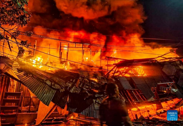 Photo taken with a mobile phone shows the scene of a fire in Gembrong Market area in Jakarta, Indonesia, on April 24, 2022. (Jakarta Fire Department/Handout via Xinhua)
