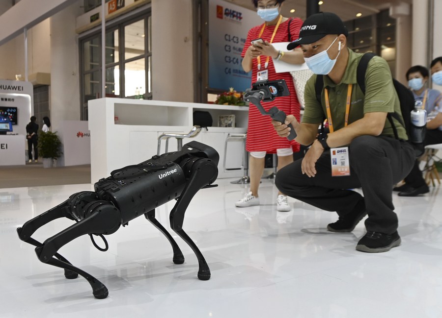 Photo taken on Sept. 8, 2021 shows an intelligent robot dog during an exhibition on BRICS New Industrial Revolution held in Xiamen, east China's Fujian Province. (Xinhua/Lin Shanchuan)