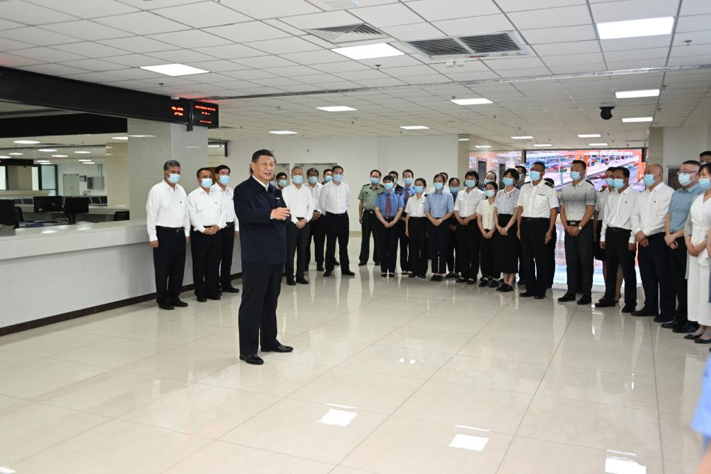 Chinese President Xi Jinping, also general secretary of the Communist Party of China Central Committee and chairman of the Central Military Commission, visits the Urumqi International Land Port Area in the city of Urumqi, capital of northwest China's Xinjiang Uygur Autonomous Region, July 12, 2022. (Xinhua/Li Xueren)