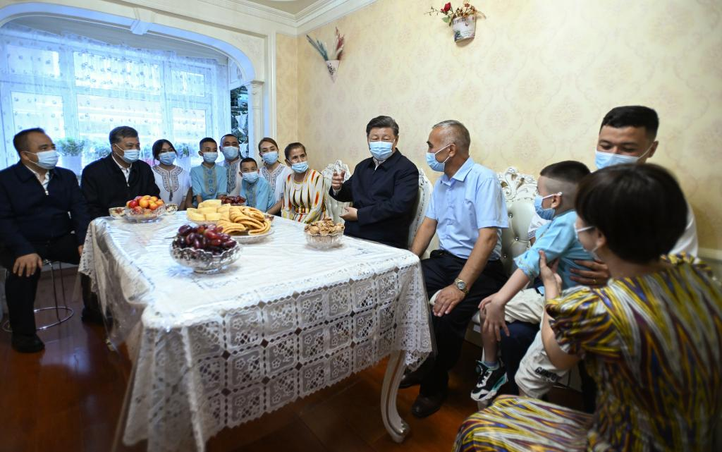 Chinese President Xi Jinping, also general secretary of the Communist Party of China Central Committee and chairman of the Central Military Commission, visits a resident's home at the community of Guyuanxiang in the Tianshan District in the city of Urumqi, capital of northwest China's Xinjiang Uygur Autonomous Region, July 13, 2022. (Xinhua/Xie Huanchi)