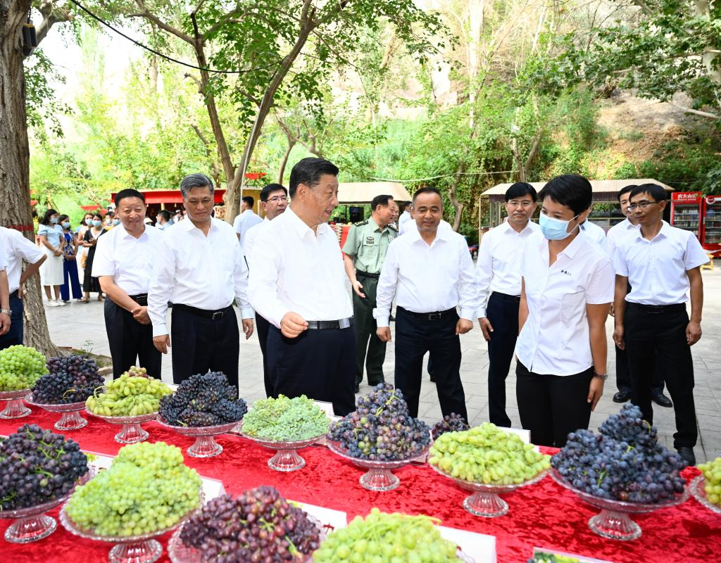 Chinese President Xi Jinping, also general secretary of the Communist Party of China Central Committee and chairman of the Central Military Commission, visits an agricultural products processing company in a local village of Turpan, northwest China's Xinjiang Uygur Autonomous Region, July 14, 2022. Xi made an inspection tour in Xinjiang from Tuesday to Friday. (Xinhua/Xie Huanchi)