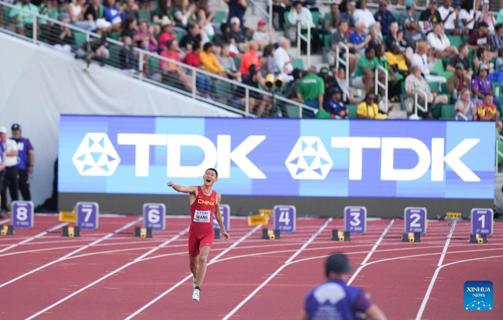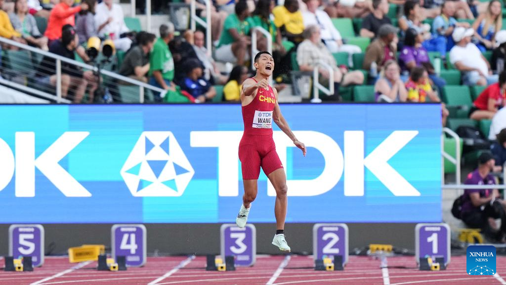 Wang Jianan of China reacts after winning the men's long jump final at the World Athletics Championships Oregon22 in Eugene, Oregon, the United States, July 16, 2022. (Xinhua/Wang Ying)
