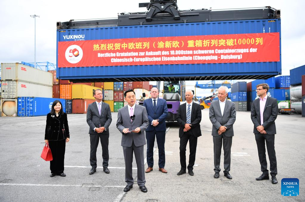 Photo taken on July 11, 2022 shows a scene from the welcome ceremony for the 10,000th trip made by China-Europe freight trains operated by the China-Europe Railway Express (Chongqing) in Duisburg, Germany. A freight train loaded with electronic products, mechanical parts and daily necessities, which departed from southwest China's Chongqing Municipality on June 23, arrived in Duisburg, Germany on Monday. (Xinhua/Ren Pengfei)