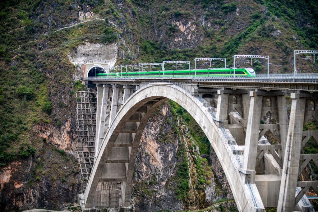 In this aerial photo, a bullet train runs on the Lancang River super major bridge along the Dali-Baoshan section of Dali-Ruili Railway in southwest China's Yunnan Province, July 19, 2022. (Xinhua/Chen Xinbo)