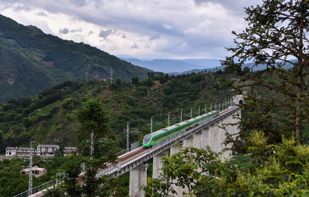 A bullet train runs for trial on a bridge along the Dali-Baoshan section of Dali-Ruili Railway in southwest China's Yunnan Province, July 19, 2022. (Xinhua/Jiang Wenyao)