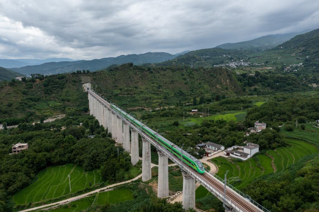 In this aerial photo, a bullet train runs for trial on a bridge along the Dali-Baoshan section of Dali-Ruili Railway in southwest China's Yunnan Province, July 19, 2022. (Xinhua/Jiang Wenyao)
