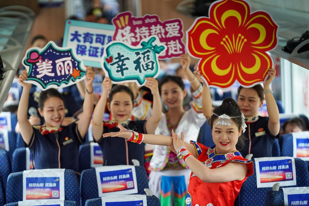Railway crew members perform aboard a bullet train running for trial along the Dali-Baoshan section of the Dali-Ruili Railway in southwest China's Yunnan Province, July 19, 2022. (Xinhua/Jiang Wenyao)