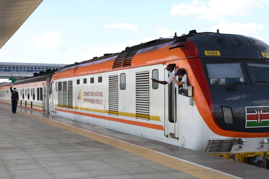 Chinese and Kenyan drivers prepare to launch the train at Nairobi station of Mombasa-Nairobi standard gauge railway (SGR) in Nairobi, capital of Kenya, Nov. 17, 2021. (Xinhua/Dong Jianghui)