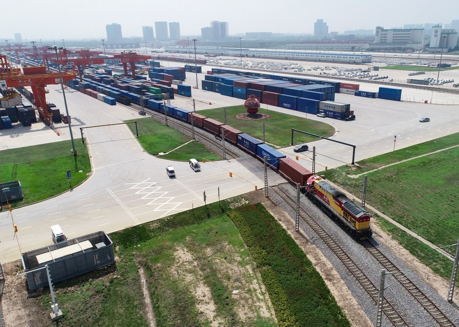 Aerial photo taken on July 29, 2022 shows Train No. X9015, a China-Europe freight train, leaving for Kazakhstan from Xi'an International Port in Xi'an, northwest China's Shaanxi Province. (Xinhua/Zhang Bowen)
