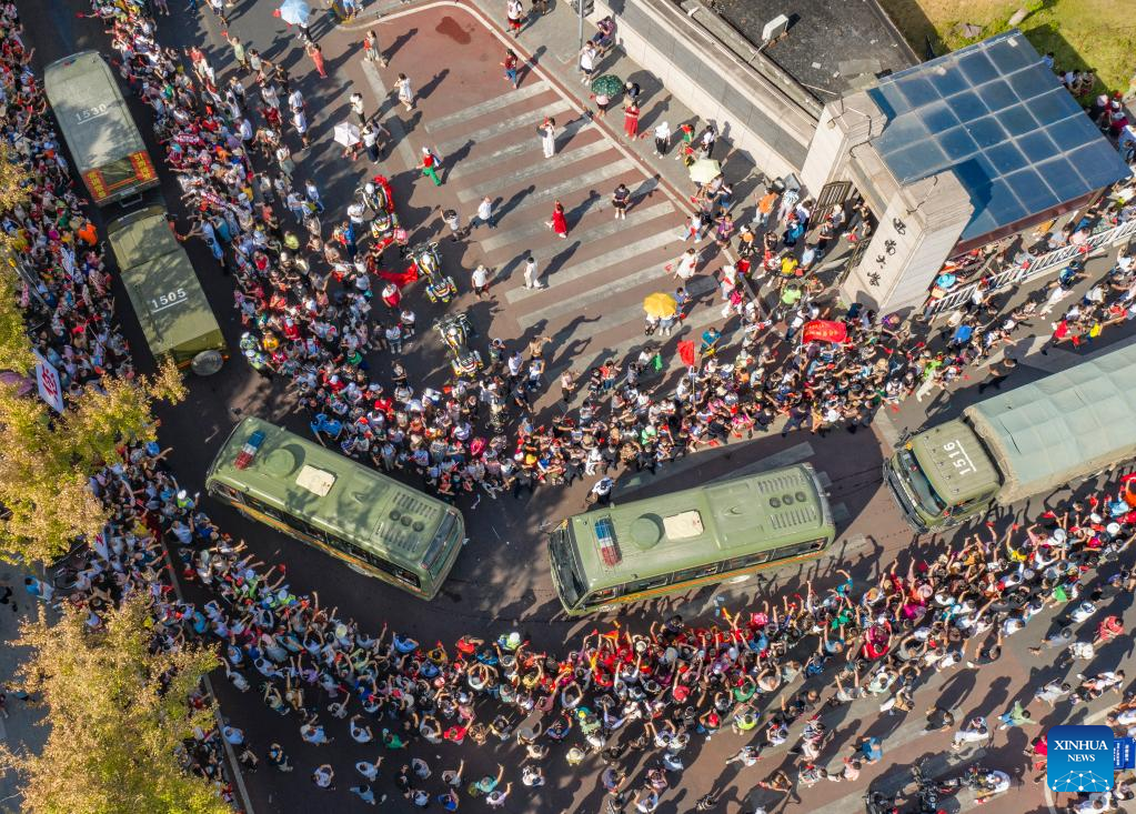 Aerial photo taken on Aug. 28, 2022 shows residents seeing off firefighters from Yunnan Province in Beibei District of southwest China's Chongqing. Over 300 firefighters from Yunnan Province left Chongqing after all open flames of the wildfires that broke out in Chongqing recently had been put out. (Xinhua/Huang Wei)