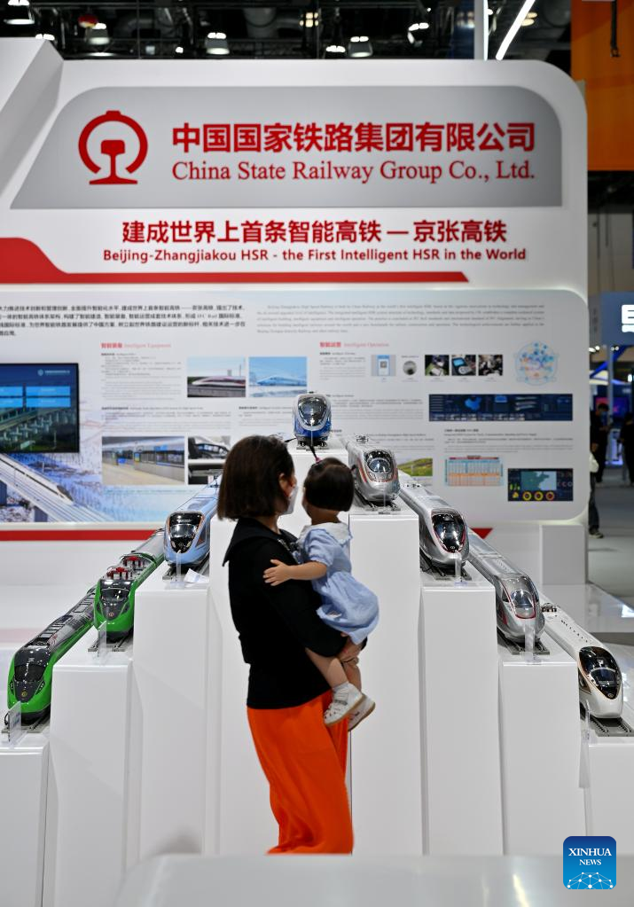 People visit the booth of China State Railway Group Co., Ltd. during the 2022 China International Fair for Trade in Services (CIFTIS) in Beijing, capital of China, on Sept. 1, 2022. The CIFTIS is held in Beijing from Aug. 31 to Sept. 5. (Xinhua/Li Xin)