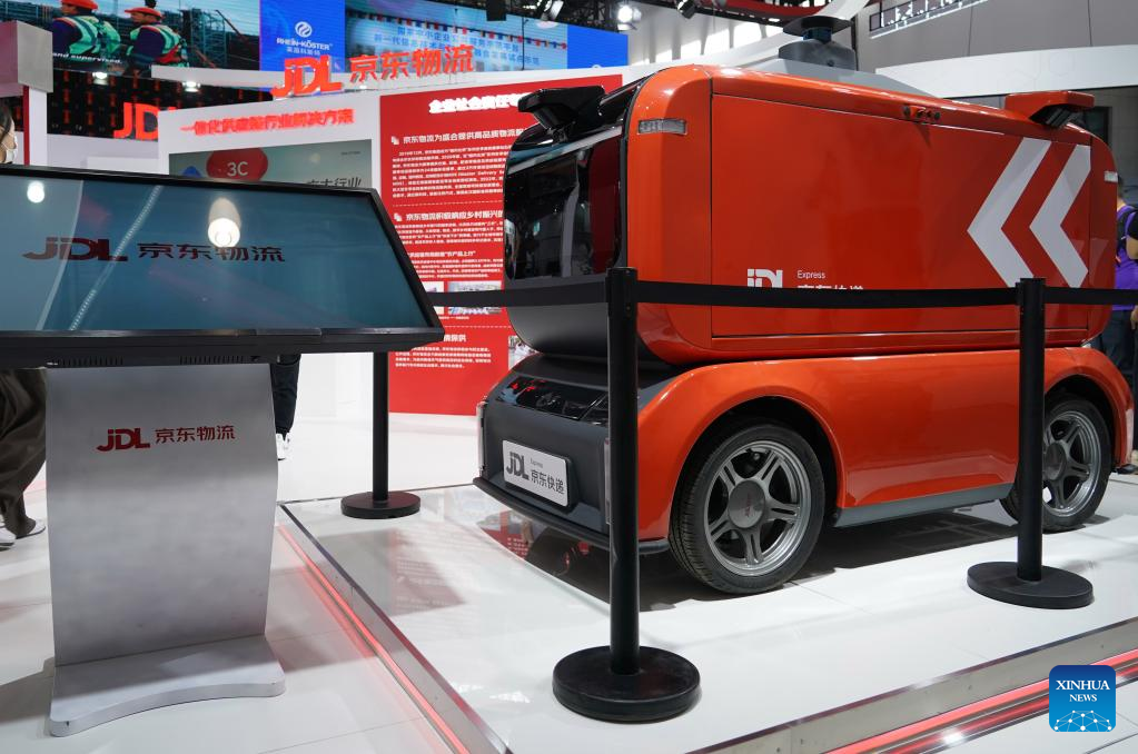 An intelligent delivery vehicle is displayed at the 2022 China International Fair for Trade in Services (CIFTIS) in Beijing, capital of China, on Sept. 1, 2022. The CIFTIS is held in Beijing from Aug. 31 to Sept. 5. (Xinhua/Ren Chao)