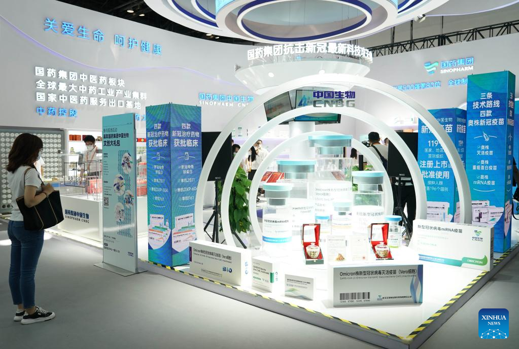 Photo taken on Sept. 1, 2022 shows the booth of Sinopharm during the 2022 China International Fair for Trade in Services (CIFTIS) in Beijing, capital of China, on Sept. 1, 2022. The CIFTIS is held in Beijing from Aug. 31 to Sept. 5. (Xinhua/Ren Chao)