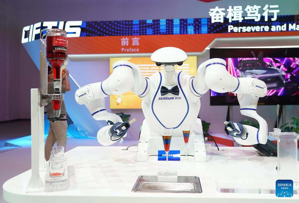 A robot is displayed at the Achievement Exhibition of China's Trade in Services during the 2022 China International Fair for Trade in Services (CIFTIS) in Beijing, capital of China, on Sept. 1, 2022. The CIFTIS is held in Beijing from Aug. 31 to Sept. 5. (Xinhua/Ren Chao)