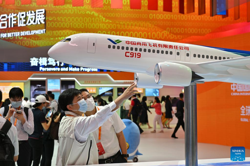 People watch a model of C919 aircraft at the Achievement Exhibition of China's Trade in Services during the 2022 China International Fair for Trade in Services (CIFTIS) in Beijing, capital of China, on Sept. 1, 2022. The CIFTIS is held in Beijing from Aug. 31 to Sept. 5. (Xinhua/Li Xin)