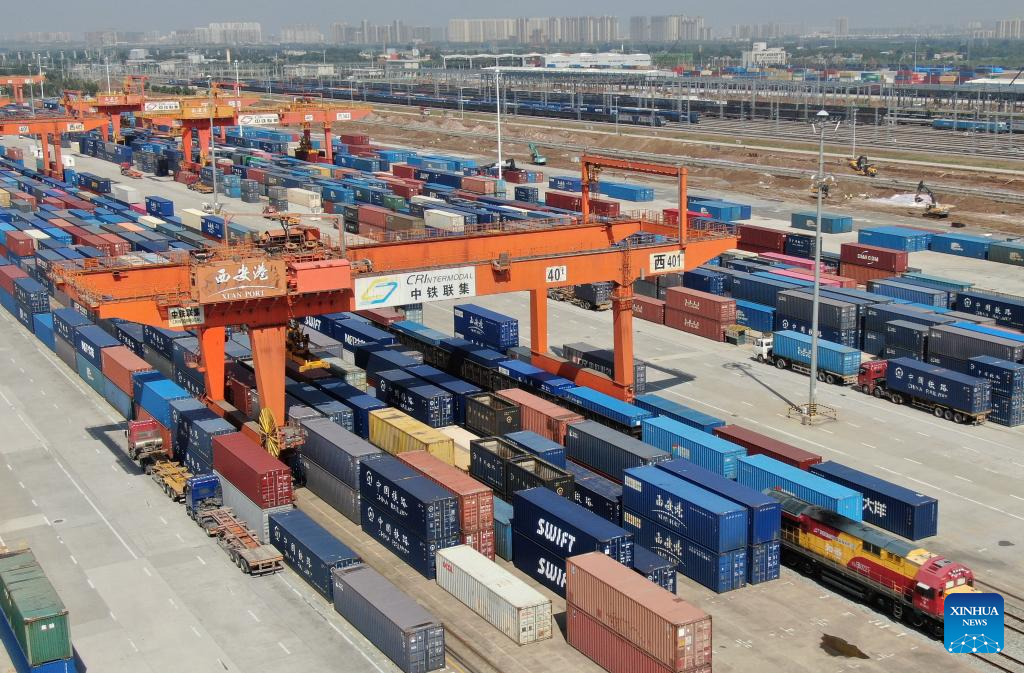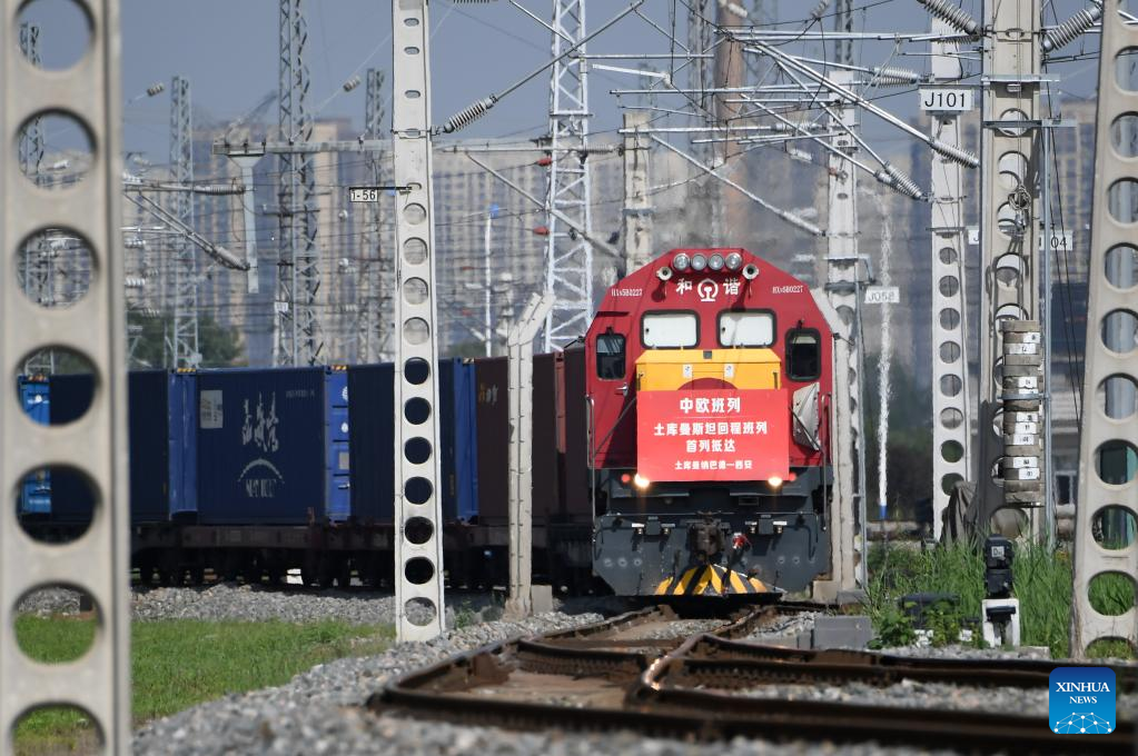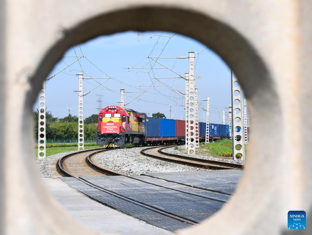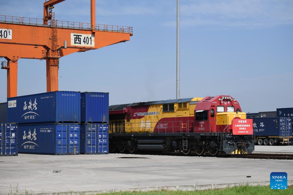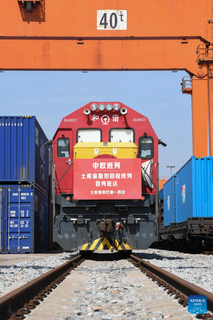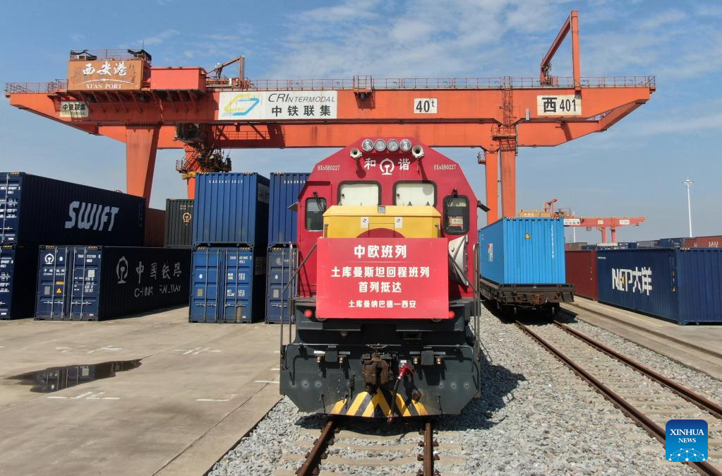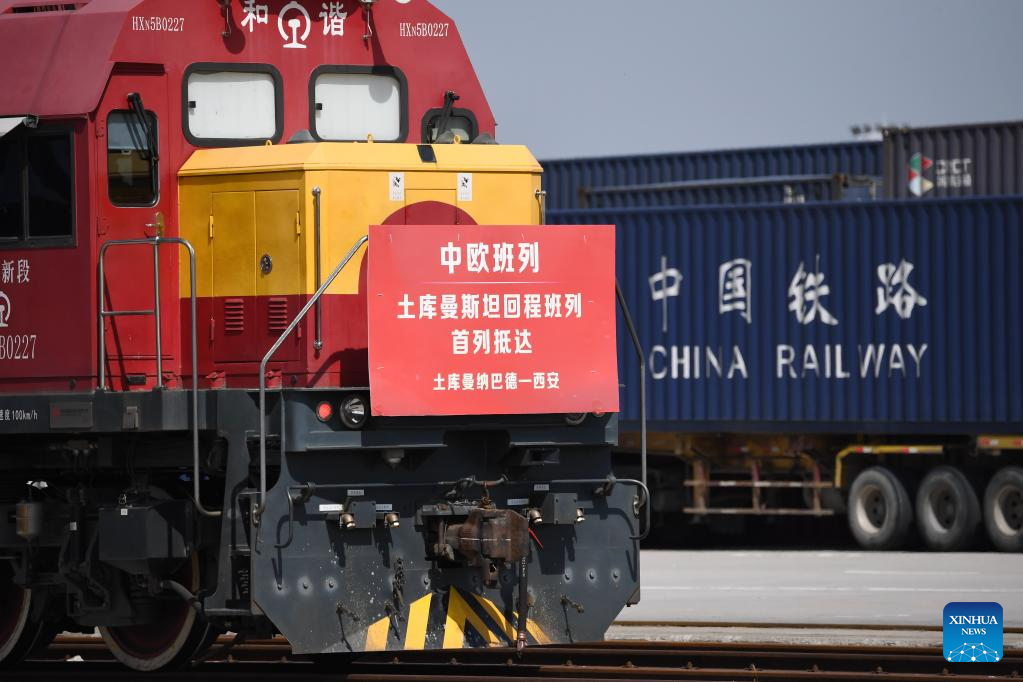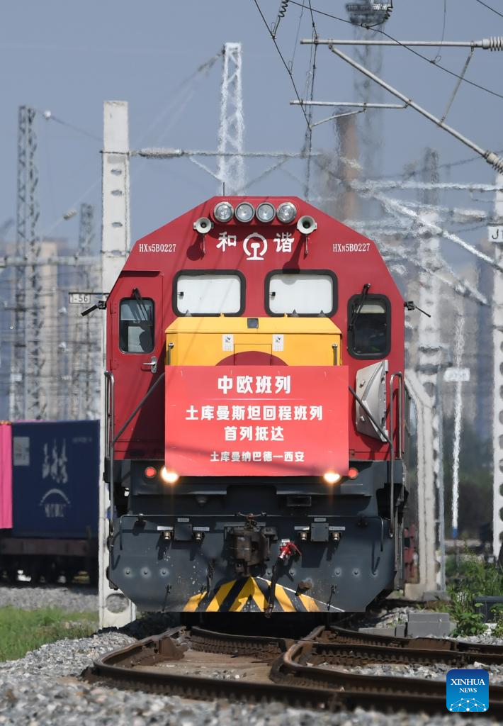 A China-Europe freight train arrives at Xi'an international port in Xi'an, northwest China's Shaanxi Province, Aug. 31, 2022. The freight train loaded with raw materials of liquorice, a Chinese medicinal herb, which departed from Turkmenistan, arrived at the Xi'an international port in Shaanxi Province on Wednesday. (Photo by Zou Jingyi/Xinhua)