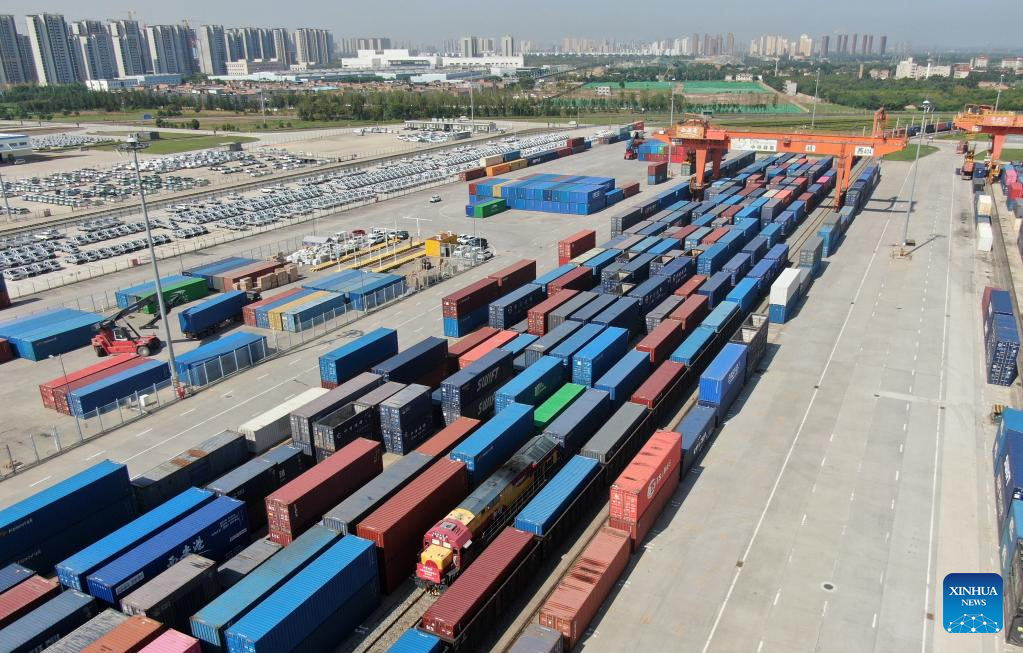 Aerial photo taken on Aug. 31, 2022 shows a China-Europe freight train arriving at Xi'an international port in Xi'an, northwest China's Shaanxi Province. The freight train loaded with raw materials of liquorice, a Chinese medicinal herb, which departed from Turkmenistan, arrived at the Xi'an international port in Shaanxi Province on Wednesday. (Xinhua/Li Yibo)