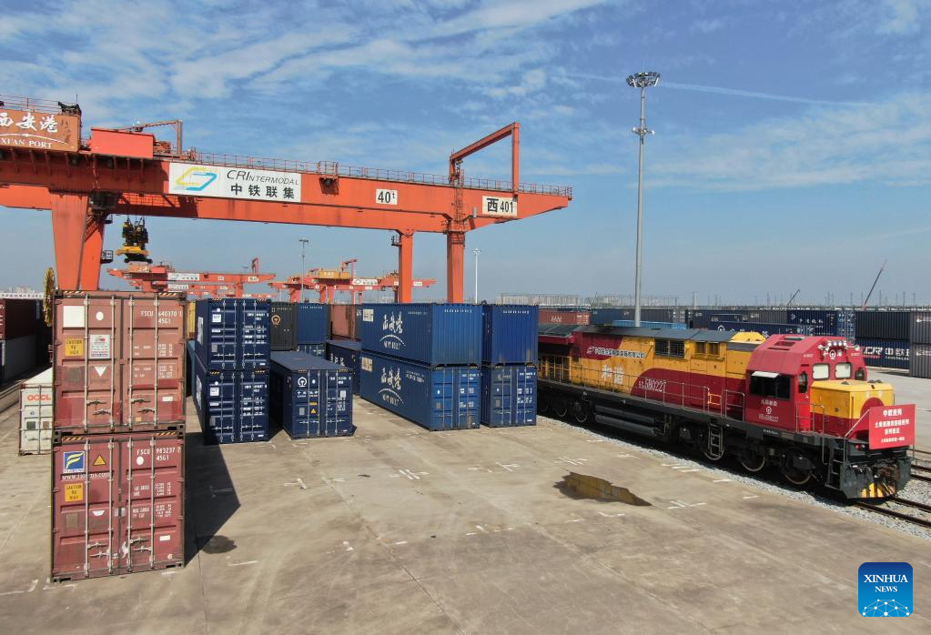A China-Europe freight train arrives at Xi'an international port in Xi'an, northwest China's Shaanxi Province, Aug. 31, 2022. The freight train loaded with raw materials of liquorice, a Chinese medicinal herb, which departed from Turkmenistan, arrived at the Xi'an international port in Shaanxi Province on Wednesday. (Xinhua/Li Yibo)