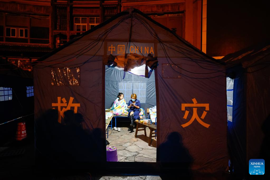 Quake-affected residents rest in a tent at a temporary shelter in Moxi Town of Luding County, southwest China's Sichuan Province, Sept. 5, 2022. (Xinhua/Shen Bohan)
