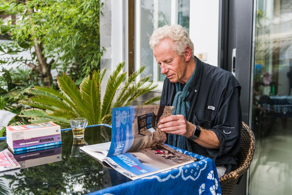 Jos Van der Wiel reads a magazine at home in Dali, southwest China's Yunnan Province, Aug. 29, 2022. (Xinhua/Cao Mengyao)