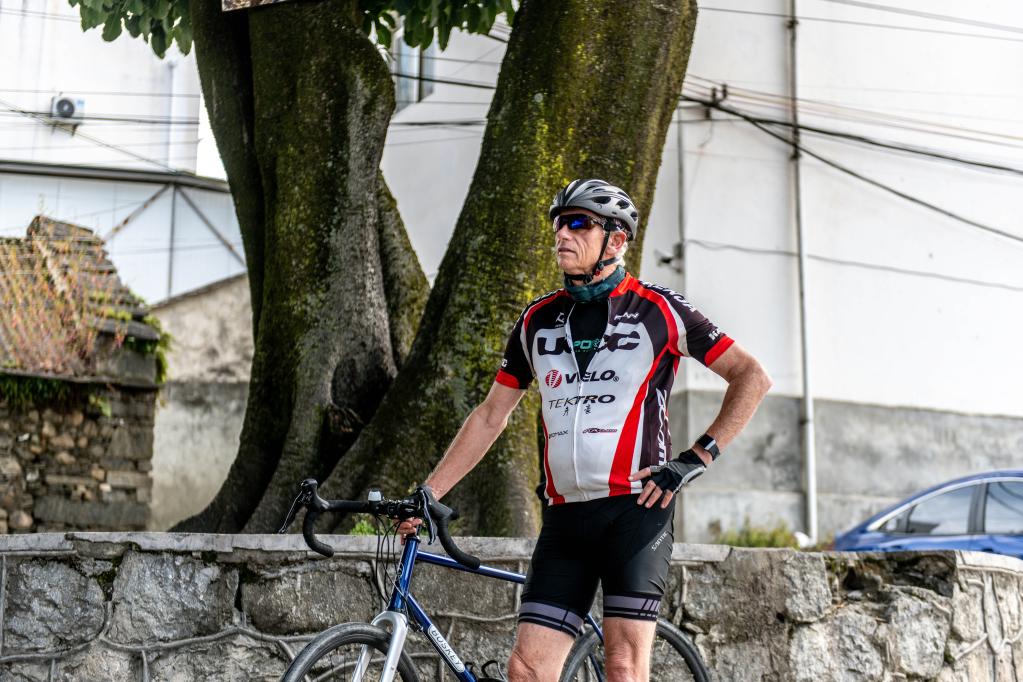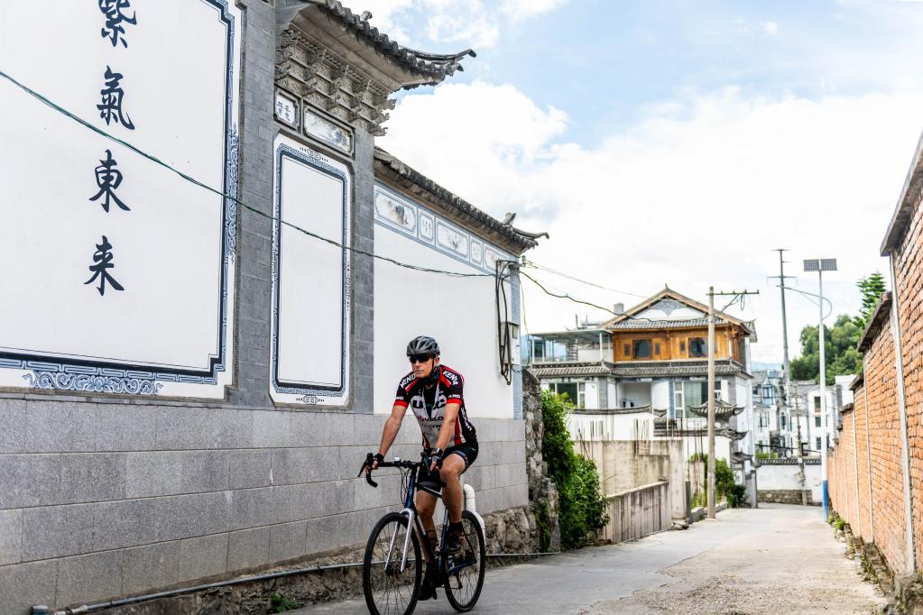 Jos Van der Wiel cycles in a village of Dali, southwest China's Yunnan Province, Aug. 29, 2022. (Xinhua/Cao Mengyao)