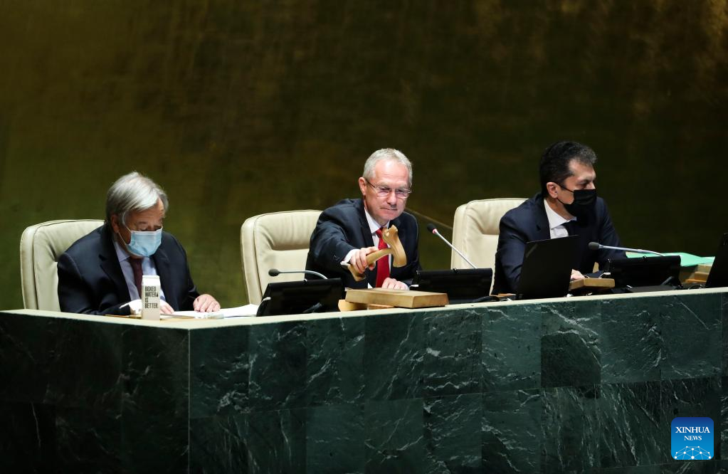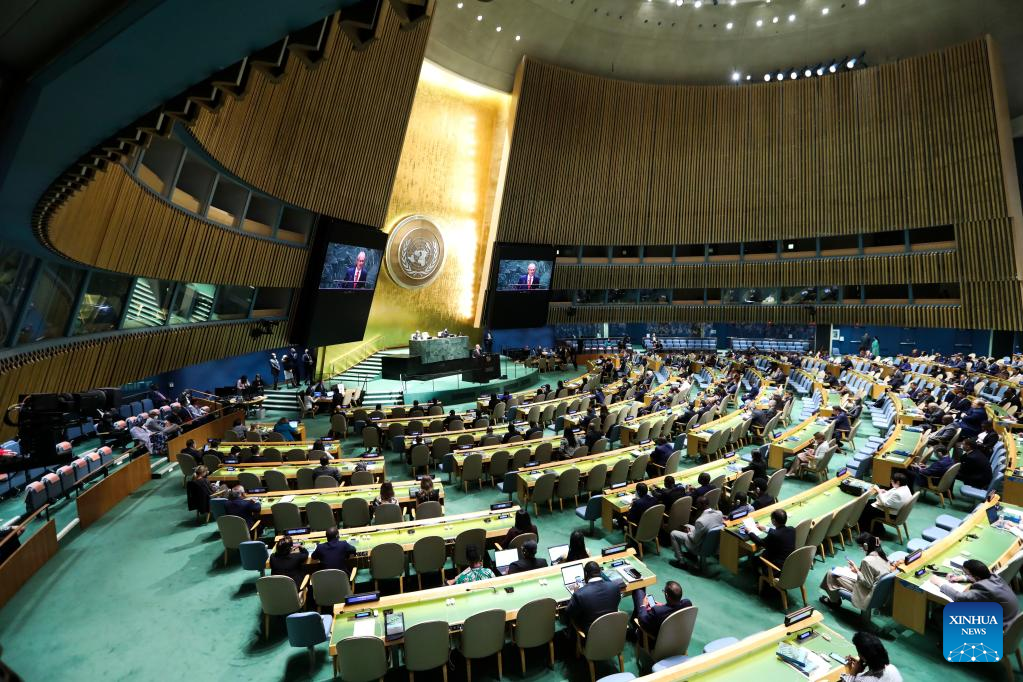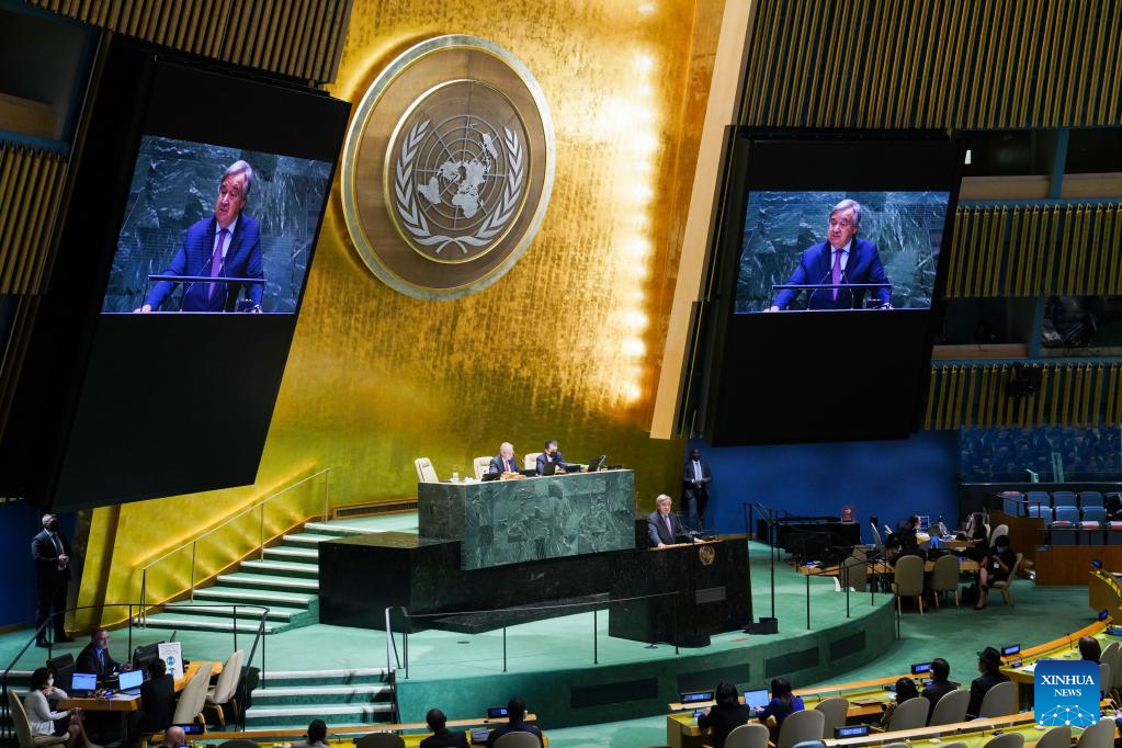 Photo taken on Sept. 13, 2022 shows the first plenary of the 77th session of the UN General Assembly at the UN headquarters in New York. The 77th session of the UN General Assembly opened on Tuesday, and UN Secretary-General Antonio Guterres called for solidarity among member states to address common challenges. (Xinhua/Wang Ying)