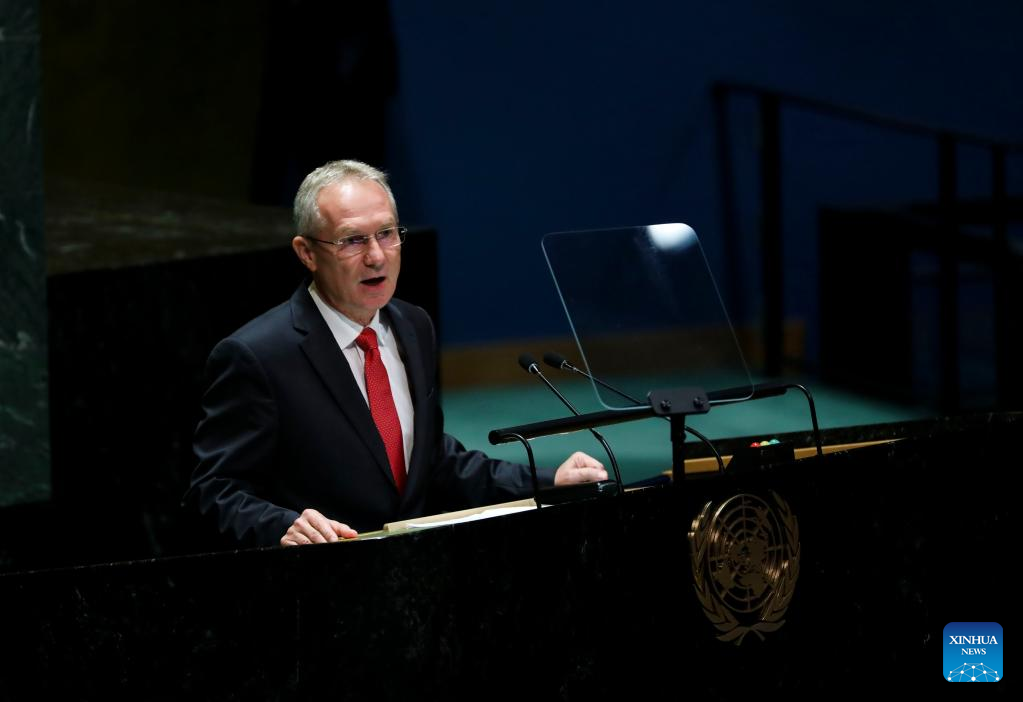 Csaba Korosi, president of the 77th session of the UN General Assembly, speaks at the first plenary of the 77th session of the General Assembly at the UN headquarters in New York, on Sept. 13, 2022. The 77th session of the UN General Assembly opened on Tuesday, and UN Secretary-General Antonio Guterres called for solidarity among member states to address common challenges. (Xinhua/Wang Ying)