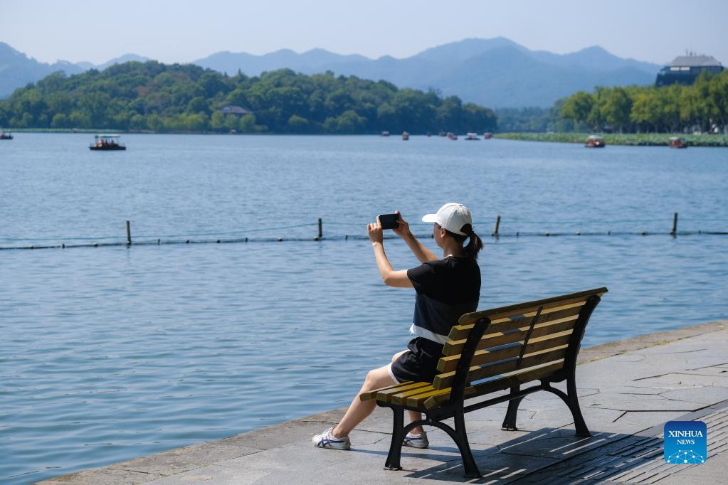 A tourist takes photos of the West Lake scenic area during the National Day holiday in Hangzhou, east China's Zhejiang Province, Oct. 2, 2022. (Xinhua/Xu Yu)