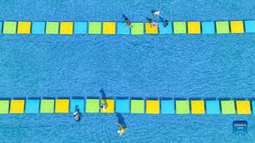 Aerial photo taken on Oct. 2, 2022 shows tourists enjoying themselves at a swimming pool during the week-long National Day holiday in Chengbei Village, east China's Zhejiang Province. (Photo by Xie Shangguo/Xinhua)