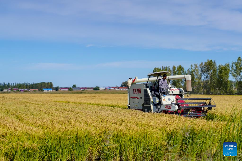 A farmer drives a farming machinery to harvest rice at a family farm in Jiutai District of Changchun, northeast China's Jilin Province, Sept. 20, 2022. Autumn harvest has recently started at the rice-growing areas across the province. (Xinhua/Yan Linyun)