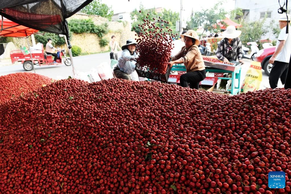 Buyers purchase hawthorn fruits in a trading market in Liudu Township of Xintai City, east China's Shandong Province, Sept. 21, 2022. Over 23,000 mu (about 1,533 hectares) of hawthorn fruits have entered the mature season here. (Xinhua/Fan Changguo)