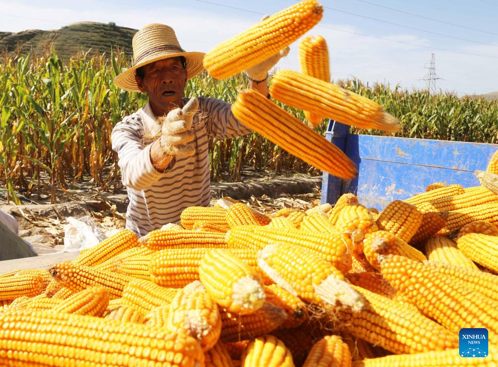 A villager loads corn cobs onto a vehicle in Huajian Village of Anding District in Dingxi City, northwest China's Gansu Province, Sept. 22, 2022. Chinese farmers' harvest festival, which coincides with the Autumn Equinox each year, falls on Sept. 23 this year. (Photo by Wang Kexian/Xinhua)