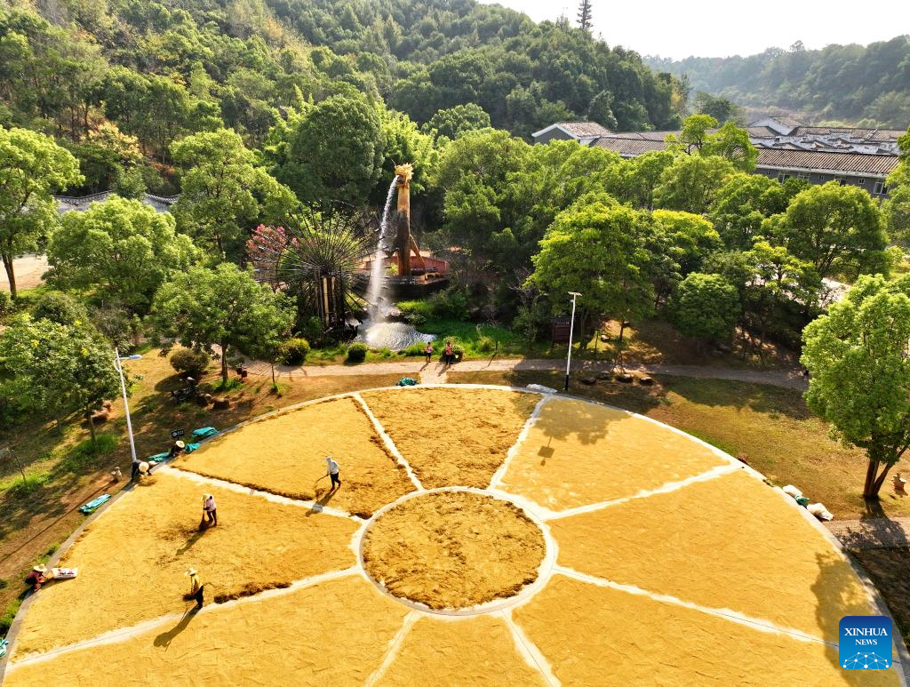 Aerial photo taken on Sept. 17, 2022 shows villagers drying rice grains in Wulong Village of Shahe Township in Ganzhou City, east China's Jiangxi Province. Chinese farmers' harvest festival, which coincides with the Autumn Equinox each year, falls on Sept. 23 this year. (Photo by Zhu Haipeng/Xinhua)