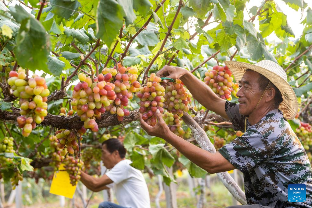 Villagers pick grapes in Bacheng Township in Kunshan, east China's Jiangsu Province, Sept. 17, 2022. Chinese farmers' harvest festival, which coincides with the Autumn Equinox each year, falls on Sept. 23 this year. (Photo by Wang Xuzhong/Xinhua)