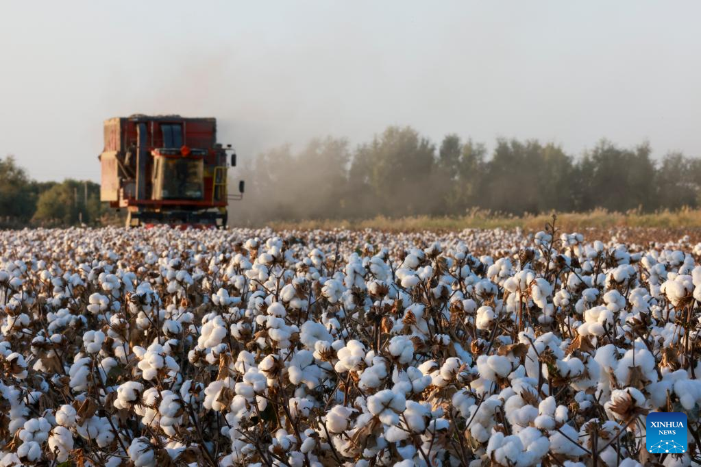 A cotton picker is seen working in fields in Xayar County, Aksu Prefecture, northwest China's Xinjiang Uygur Autonomous Region, Sept. 26, 2022. The cotton harvest season has started in Xayar County of Xinjiang. (Photo by Liu Yuzhu/Xinhua)