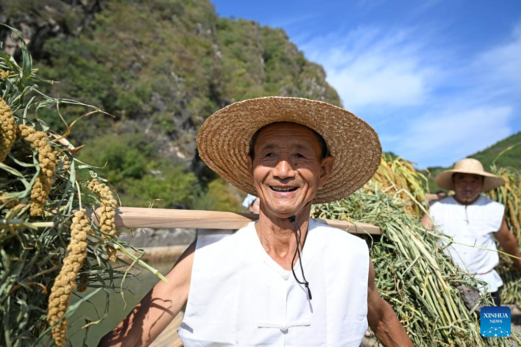 A villager carries freshly harvested millets in Nihe Village of Luozhuangzi Township, Jizhou District, north China's Tianjin, Sept. 21, 2022. Nihe Village has increased residents' incomes by promoting ecological organic millet planting in recent years. Cooperatives are set up to take charge of planting, procurement, packaging and sales of millets. (Xinhua/Zhao Zishuo)