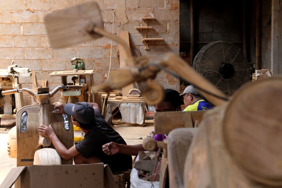 Workers make a wooden craft motorbike at Tetap Jaya Art wooden workshop in Boyolali, Central Java, Indonesia. Oct. 11, 2022. (Photo by Bram Selo/Xinhua)