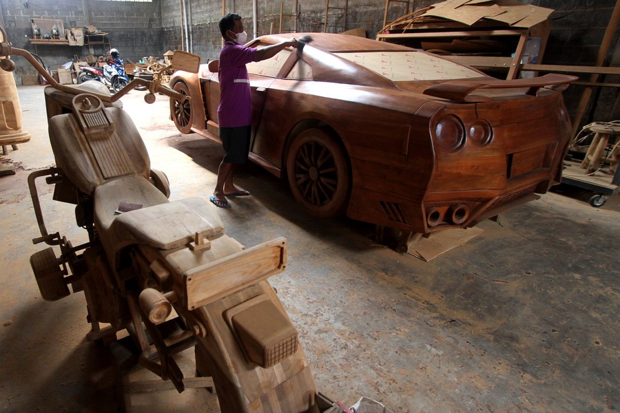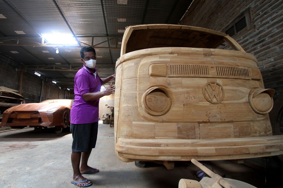 A worker makes a wooden craft vehicle at Tetap Jaya Art wooden workshop in Boyolali, Central Java, Indonesia. Oct. 11, 2022. (Photo by Bram Selo/Xinhua)
