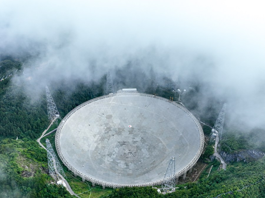 This aerial photo shows the Five-hundred-meter Aperture Spherical Radio Telescope (FAST) under maintenance in southwest China's Guizhou Province on July 22, 2022. (Xinhua/Ou Dongqu)